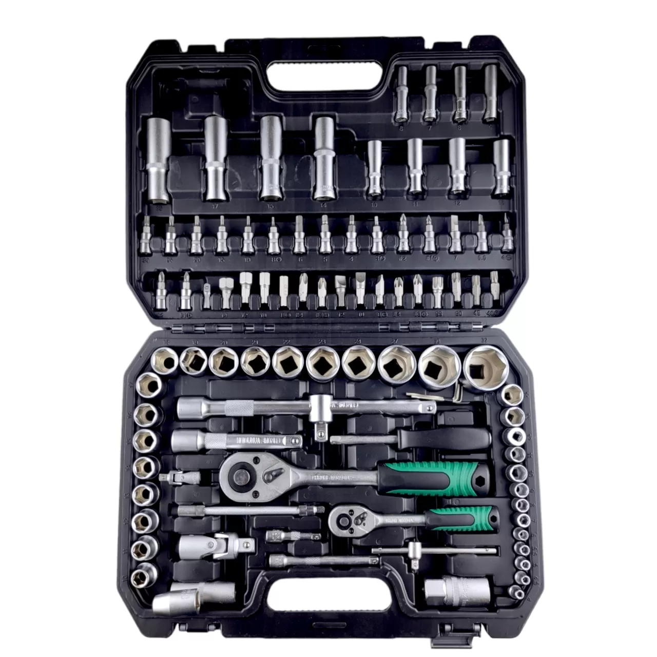 Набор инструментов для авто 94 предмета имеет в комплекте ключи-трещотки с обратным реверсом и удобными двухкомпонентными рукоятками. Поставляется профессиональный набор инструментов в удобном, закрывающемся кейсе для надежного хранения и транспортировки.