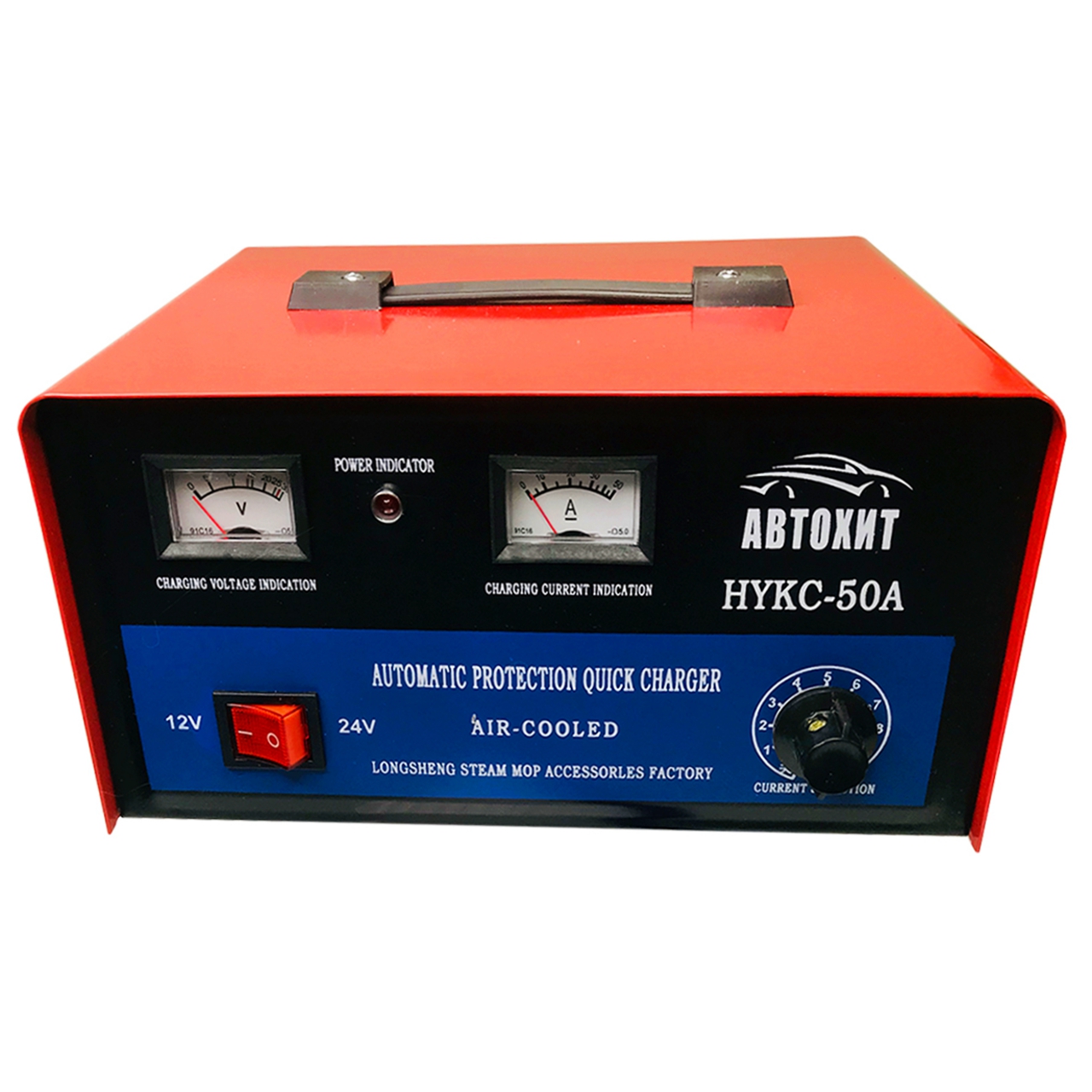 Импульсное зарядное устройство для аккумуляторов мотоциклов, автомобилей, аккумуляторов для ИБП. АвтоХит 50 А представляет собой трансформаторное устройство для зарядки свинцово-кислотных аккумуляторов напряжением 6,12, 24 В. АвтоХит прост в использовании, а главное эффективен в применении. Устройство позволит зарядить аккумулятор на полную мощность с 10 - 25 ампер. А применив максимальную выходную силу тока в 50 ампер, можно моментально запустить двигатель. На передней панели устройства расположены ступенчатый регулятор интенсивности заряда, амперметр, вольтметр и переключатель напряжения. На задней панели расположен предохранитель.