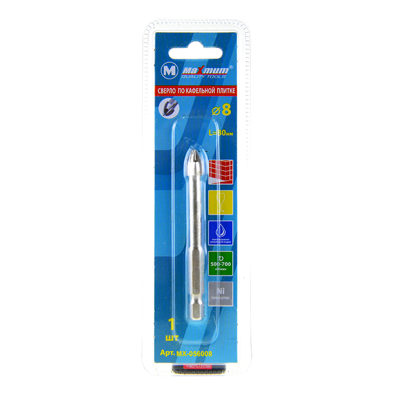 Сверло по кафельной плитке диаметром 8 мм от Maximum предназначено для сверления отверстий в плитке, керамике и стекле. Сверло с никелевым покрытием имеет твердосплавную напайку с алмазной заточкой. Устанавливается на дрели и перфораторы с зажимным патроном.